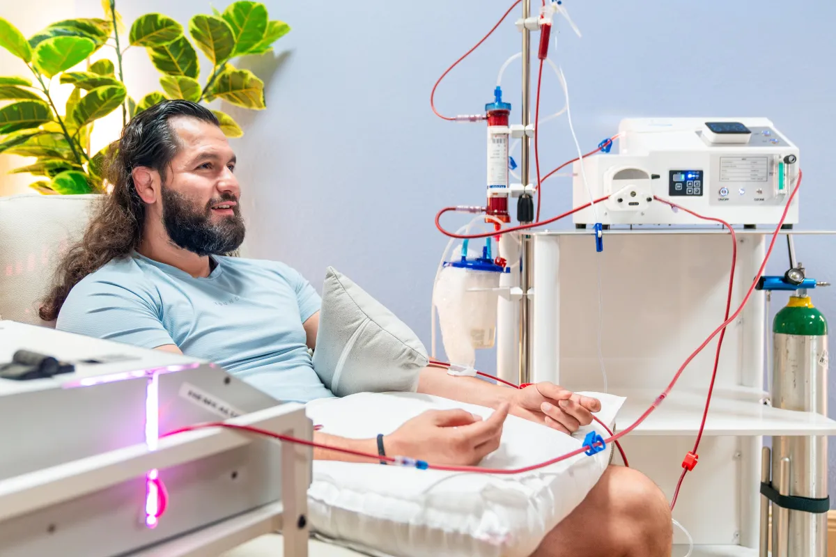 EBOO (Extracorporeal Blood Oxygenation and Ozonation) is an advanced, non-invasive therapy that deeply purifies and oxygenates your blood. It's a next-generation form of ozone therapy designed to filter out toxins, revitalize your cells, and supercharge your body's natural healing abilities.